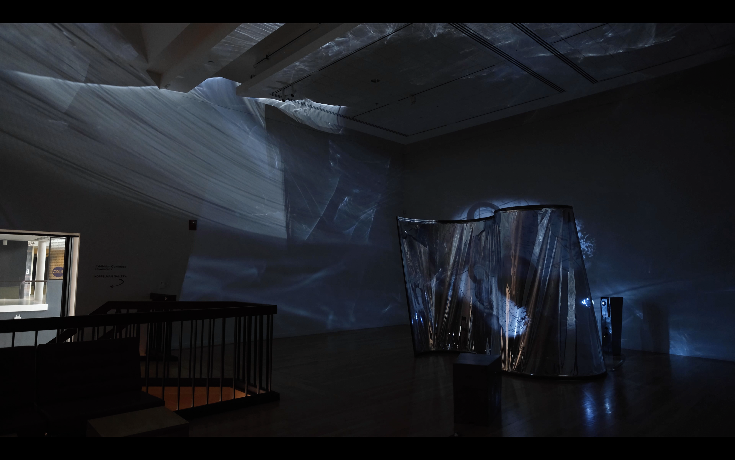 Two-channel video with stereo sound, one-way mirror film, steel, glass, water